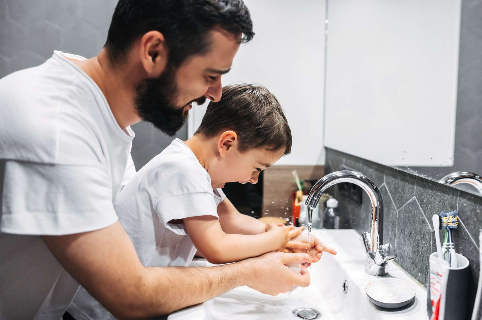 • Kind poetst tanden in moderne badkamer met houtlook wandtegels en marmer wastafel, voor een warme en luxe uitstraling.