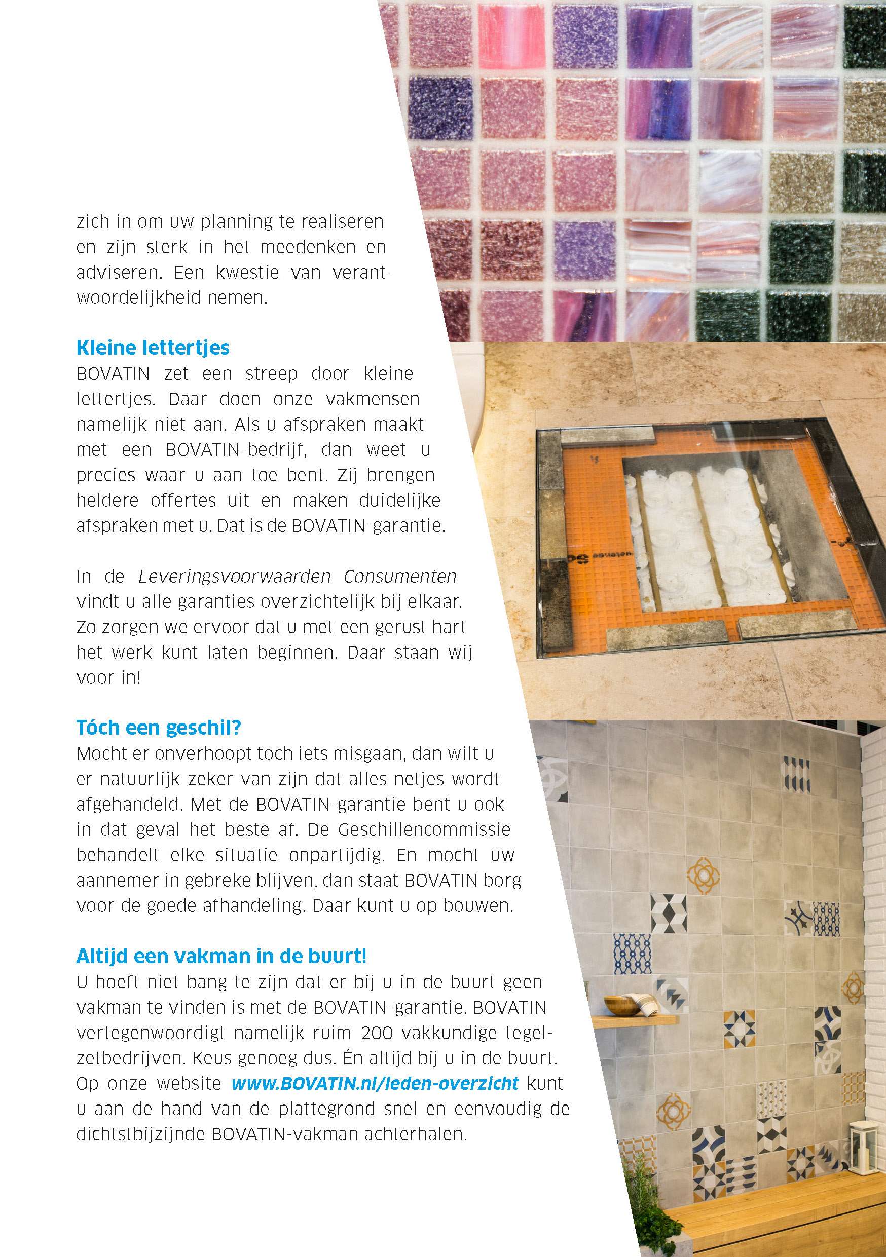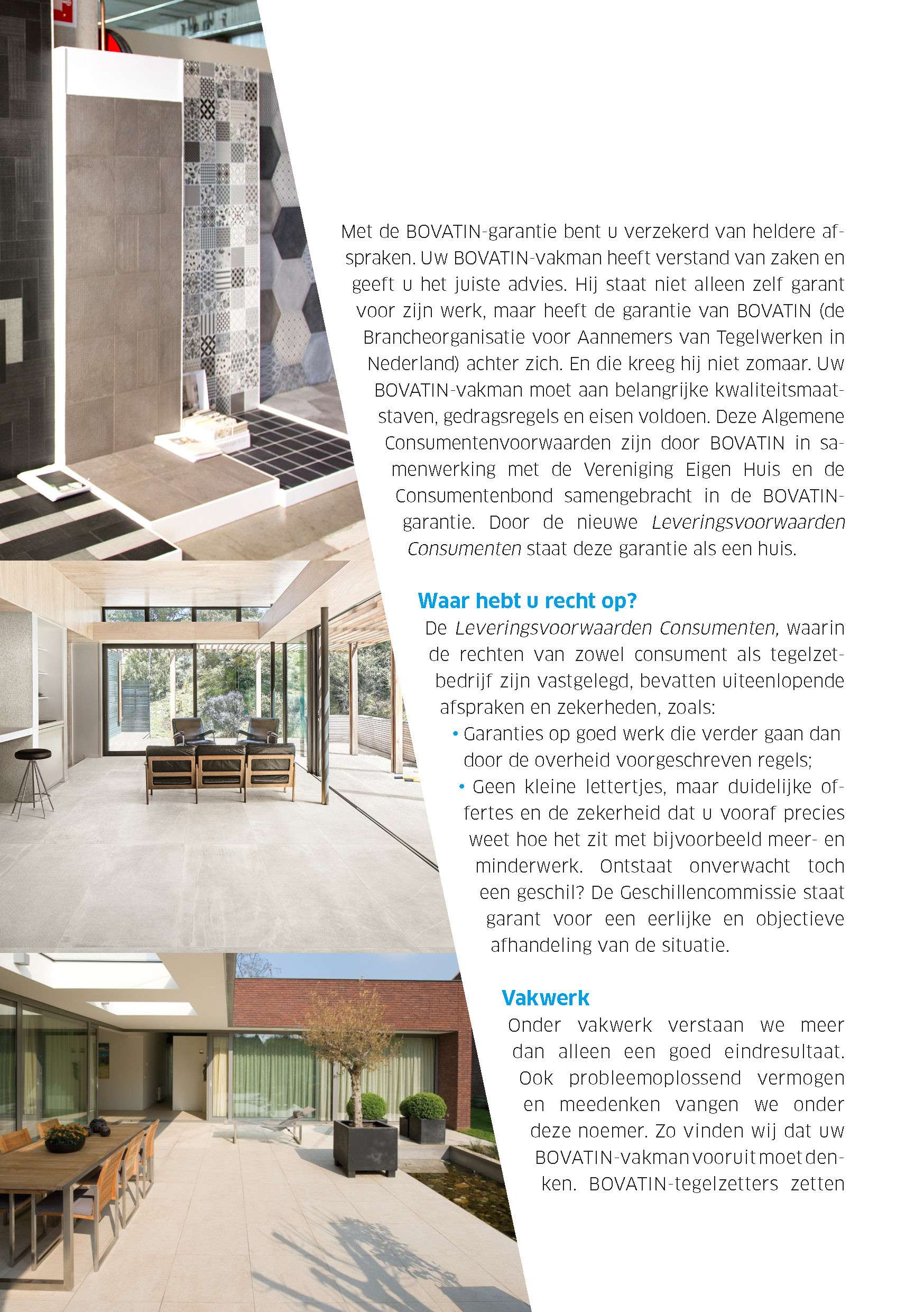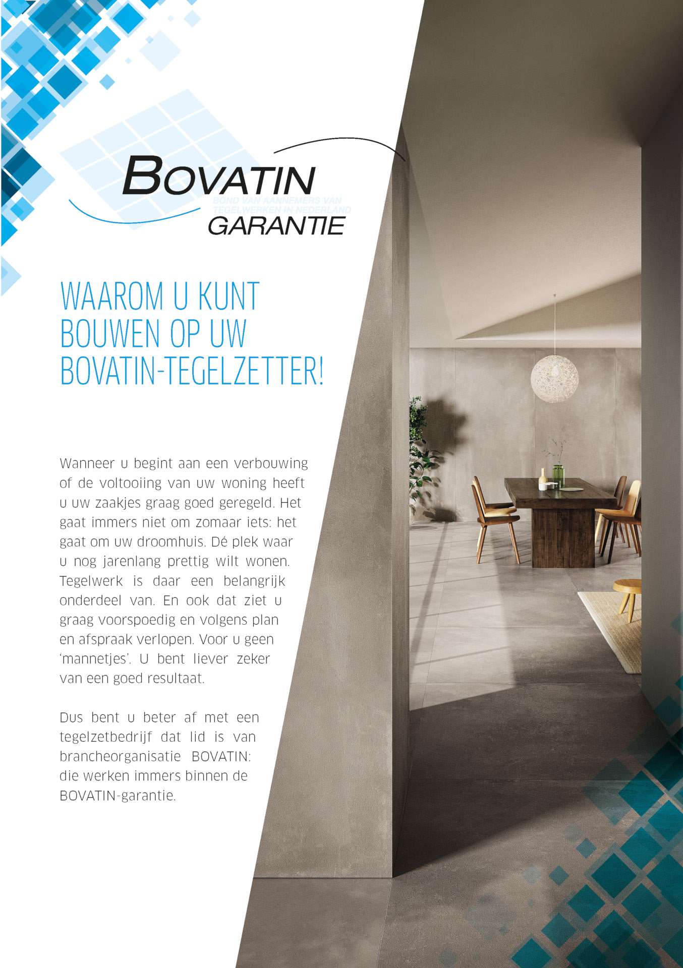 Je hebt je keuze gemaakt. Je weet wat je wilt in je badkamer, keuken, wc of welk deel van het huis je onderhanden wilt nemen. En nu? Je wilt natuurlijk wel jarenlang genieten van je mooie nieuwe tegels en dat ze netjes geplaatst zijn. Kies daarom een tegelzetter die is aangesloten bij de bovatin, dan ben je verzekerd van kwaliteit. Lees hieronder alles over de bovatin garantie: